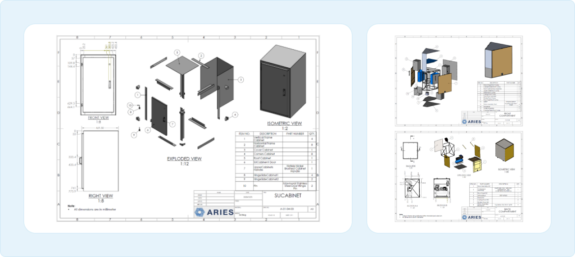 Outcome: Produced comprehensive 2D drawings including orthographic views, section views, and detailed callouts for all major components. Included precise dimensions, tolerances, GD&T symbols, BOM tables, and material specifications. Ensured drawings were production-ready and aligned with fabrication requirements.